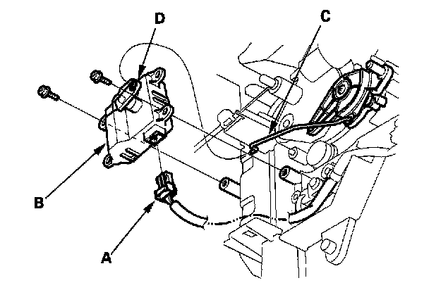 Air Mix Control Motor Replacement1. Disconnect the 5P connector (A) from the air mix control motor (B). Remove the self-tapping screws and the air mix control motor from the heater unit. Remove the rod (C) from the arm (D) of the air mix control motor.