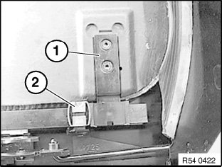 Pull headliner (1) to left/upwards with sliding members (2) out of rail (3).