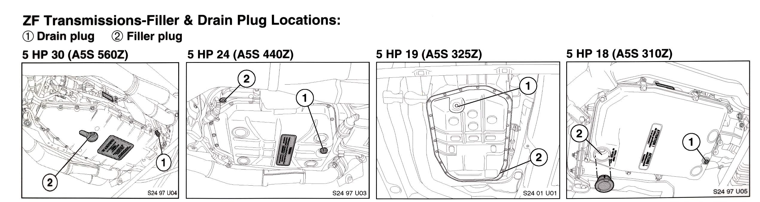 Automatic Transmission Drain and Fill Locations, GM and ZF Models.