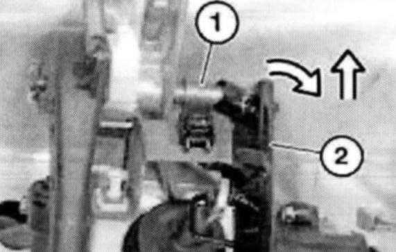 Detach retainer (1) and pull brake pedal off bearing block. If necessary, tilt panel (2) upwards.