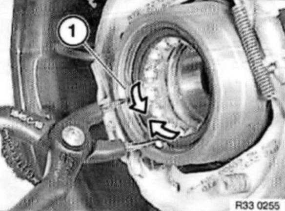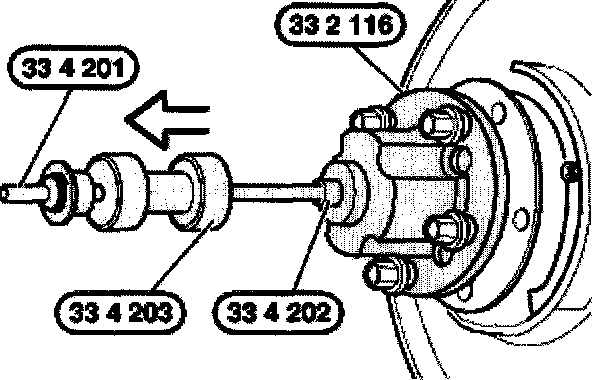 Draw in new wheel bearing (1) with special tool 33 3 261 / 264 / 265.