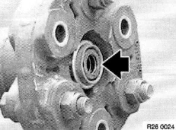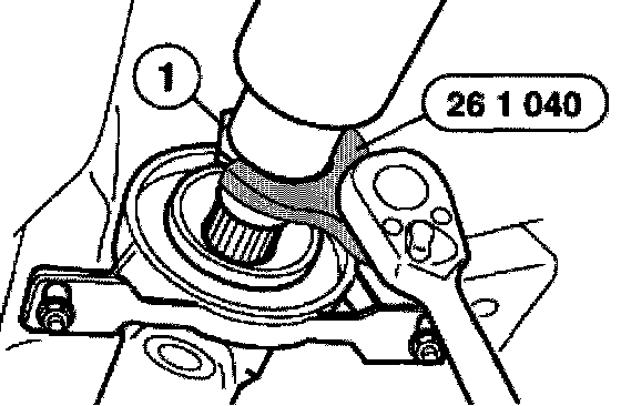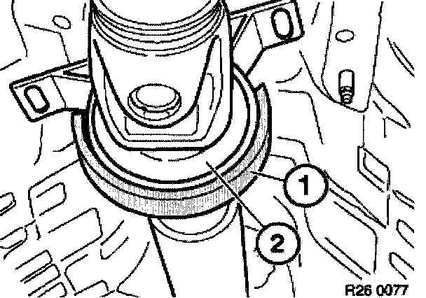 Caution: Remove butylene tape already attached to center bearing. Clean adhesive area on center bearing and on body. Then coat adhesive area on body with mineral oil. This coating with oil is necessary to facilitate insertion of the sticky butylene tape in the propeller shaft tunnel, This prevents the butylene tape from being deformed.