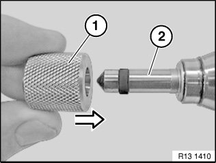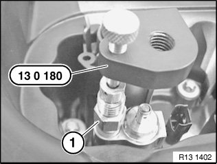 Remove PTFE sealing ring (1) with special tool 13 0 191 from injector (2).