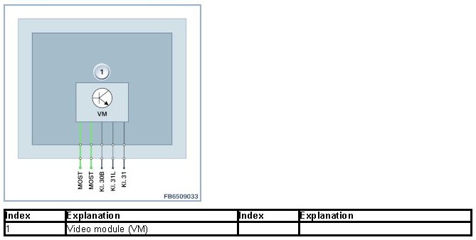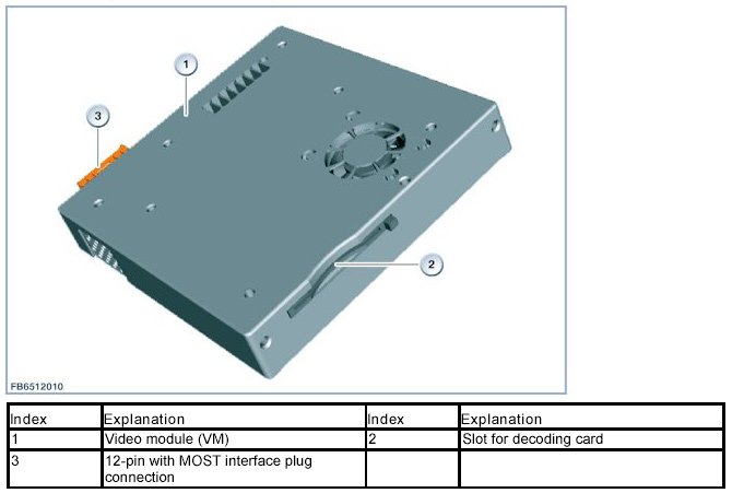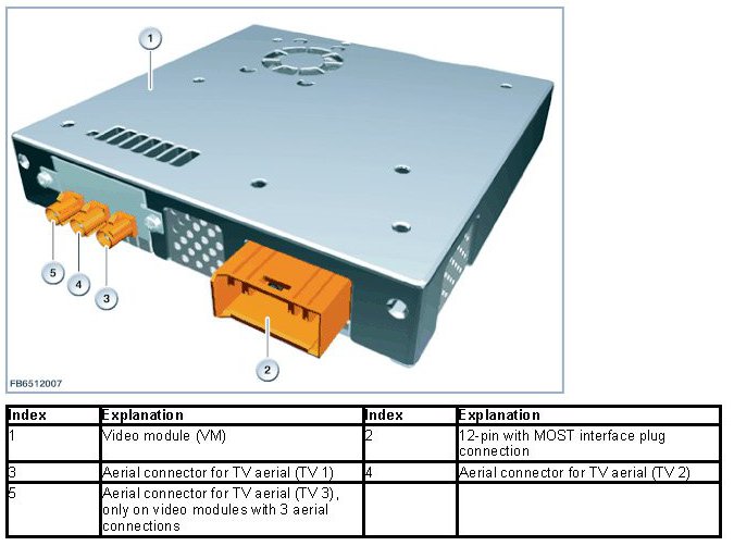 The video module (VM) is connected to the vehicle electrical system and the MOST via a 12-pin plug connection with a MOST interface.