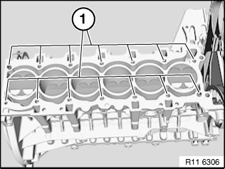 There must be no fluids or contaminants in any of the threaded holes (1) for the cylinder head bolt connections.