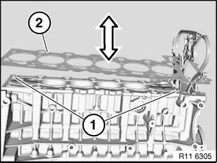 Place cylinder head gasket (2) in direction of arrow on engine block.