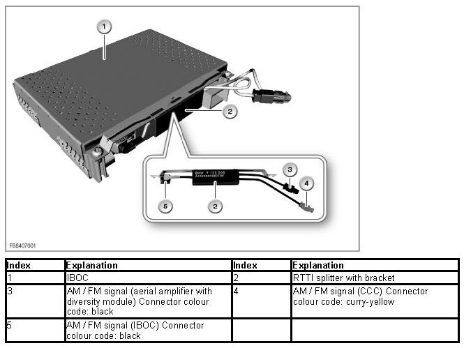 In order to guarantee the traffic warning service "Real Time Traffic Information (RTTI)", a passive aerial splitter is fitted at the IBOC control unit. This enables the HF signals to be made available to the IBOC control unit and the CCC. RTTI is only available in conjunction with the Professional navigation system. The CCC provides the received traffic information to the navigation system.