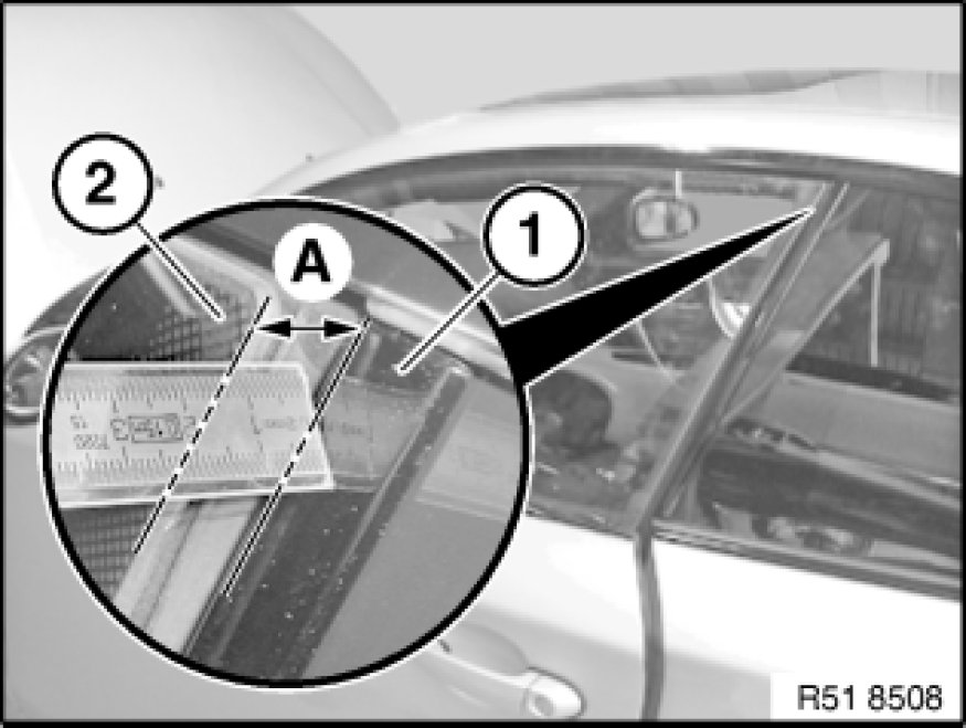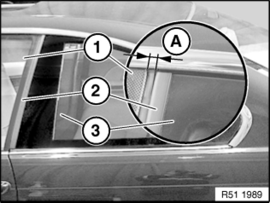 Door window glass (1) must be positioned at measurement (A) and parallel to trim (2).