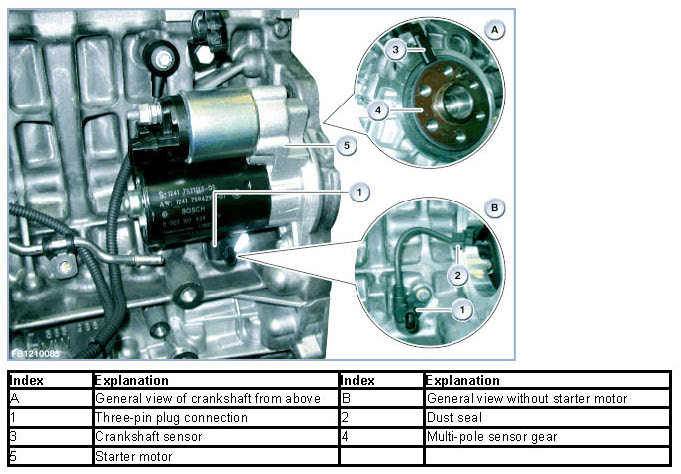 The crankshaft sensor is integrated in the radial sealing ring. The crankshaft sensor picks up the position of the crankshaft by means of a multi-pole sensor wheel bolted onto the flywheel. The Digital Engine Electronics (DME) uses this to calculate the engine speed. The camshaft sensor and the crankshaft sensor are needed for fully sequential fuel injection (fuel injection takes place individually optimized for each cylinder at the specific ignition point).
