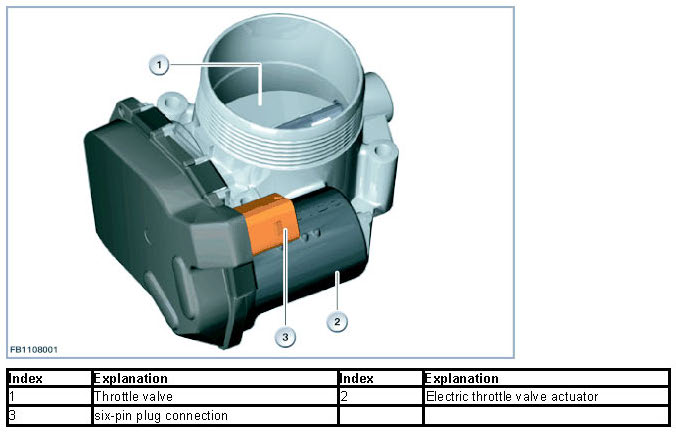 The electrical throttle valve actuator motor is attached to the intake air collector. The Digital Engine Electronics (DME) use this to calculate the position of the throttle valve: