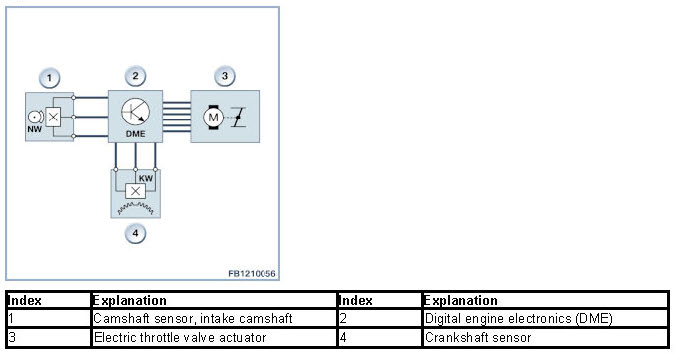 The crankshaft sensor delivers a signal regarding the position of the crankshaft to the Digital Engine Electronics (DME). The Digital Engine Electronics (DME) use this signal to calculate the engine speed. With additional information from other control units (for example, power requirement of the auxiliary components), the Digital Engine Electronics (DME) regulate a stable idle speed.
