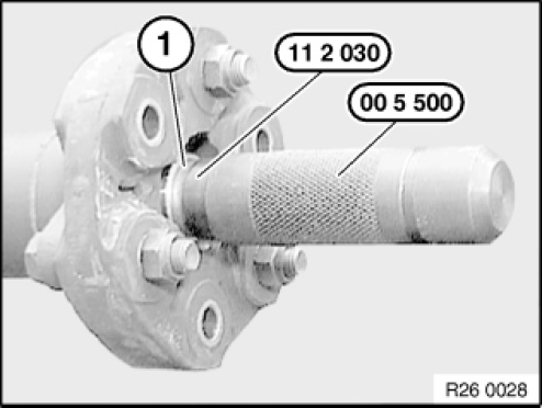 Drive in centring mount (1) with special tools 11 2 030 and 00 5 500 into propeller shaft (observe protrusion).