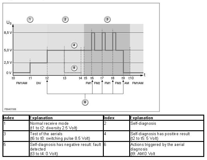 The self-diagnosis of the aerial diversity is triggered in the test module of the BMW diagnosis system. The self-diagnosis includes a check of the aerial inputs on the basis of a current measurement (direct current). If a fault is found, the aerial diagnosis aborts after the self-diagnosis.