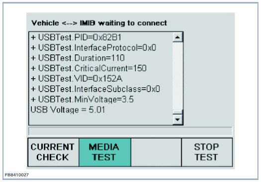 NOTE: It is not necessary to connect the IMIB to the network or an ISID in order to carry out the USB test. The results of the USB tests are not included in the diagnosis report. The USB tests must be used as independent tools for diagnosing vehicle belonging to the BMW group. The testing of other USB components (PC, data carriers, accessories etc.) is not permitted and could cause permanent damage to the IMIB. The tested USB connection is only fully functional if both tests can be successfully completed. Only the electrical test (current check) for voltage and current can be carried out at the USB connection in the glove compartment (not the media test). If one of the two tests is not performed successfully, a vehicle diagnosis must be carried out with the ISTA! Warranty-related invoicing can only take place after a full diagnosis has taken place.