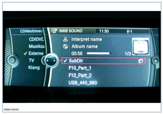 IMIB SOUND must be selected via the controller in order to display and play the music files. Check volume control in vehicle. A total of 3 media files and a sub-directory (SUBDIR) with contents are offered. To find the subdirectory,