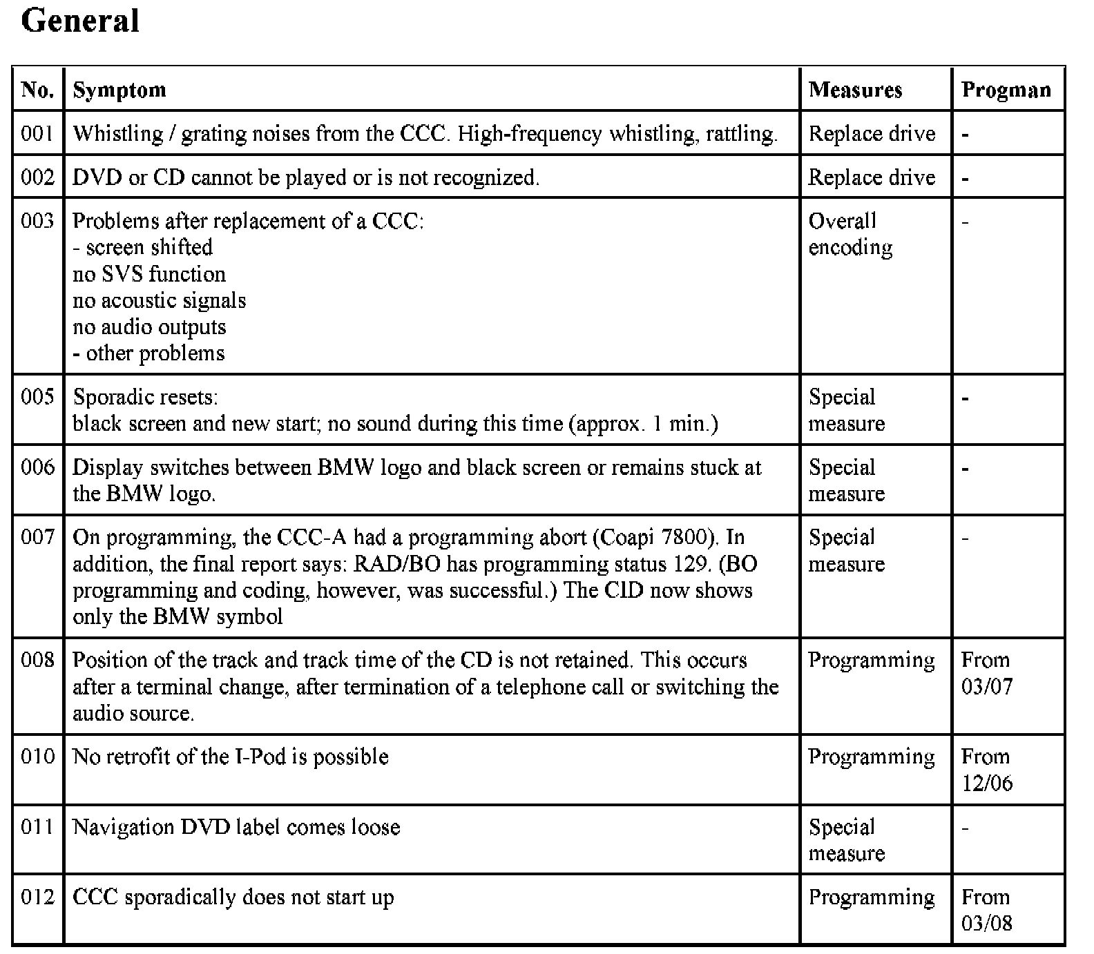 The navigation system Professional (CCC) is a complex control module with a large number of possible fault profiles. The following list shows known symptoms in the functional area CCC audio and navigation. Fault profiles from the functional areas of telephone and Telematic services as well as integrated heating / air conditioner control are not covered in this test module.