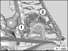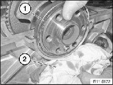 Secure flywheel with special tool (1) 11 9 260 and special tool (2) 11 9 266.