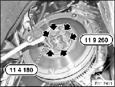 Screw special tool 11 9 182 with screws (special tool 11 9 184 ) to crankshaft.
