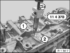 Slowly insert liquid sealing compound (1) with special tool 11 4 370 in direction of arrow.