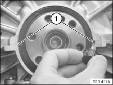 Make sure that the special tool (1) completely engages in the flywheel teeth (see arrow)