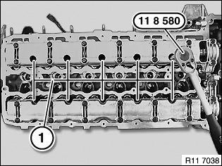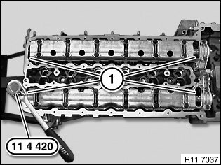 Release cylinder head bolts (1) M10 with special tool 11 8 580 from outside inwards.