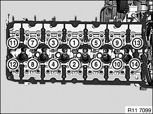Insert cylinder head bolts (11 to 14) with special tool 11 4 420.