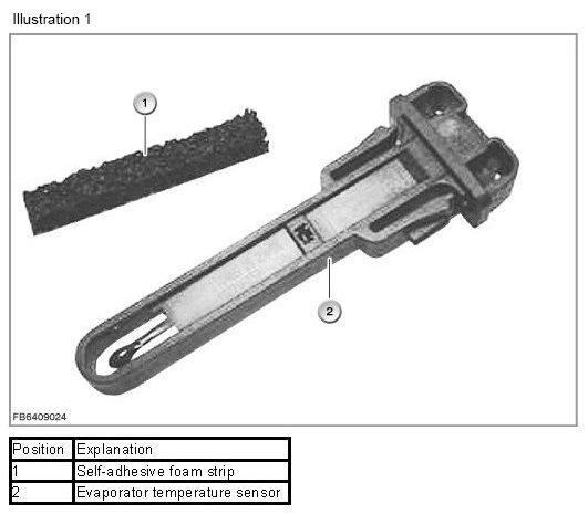 Warm excess air can flow between evaporator and housing wall and hit the evaporator temperature sensor. The following graphics illustrate the affixing of a self-adhesive foam strip on the evaporator temperature sensor, which eliminates the fault.