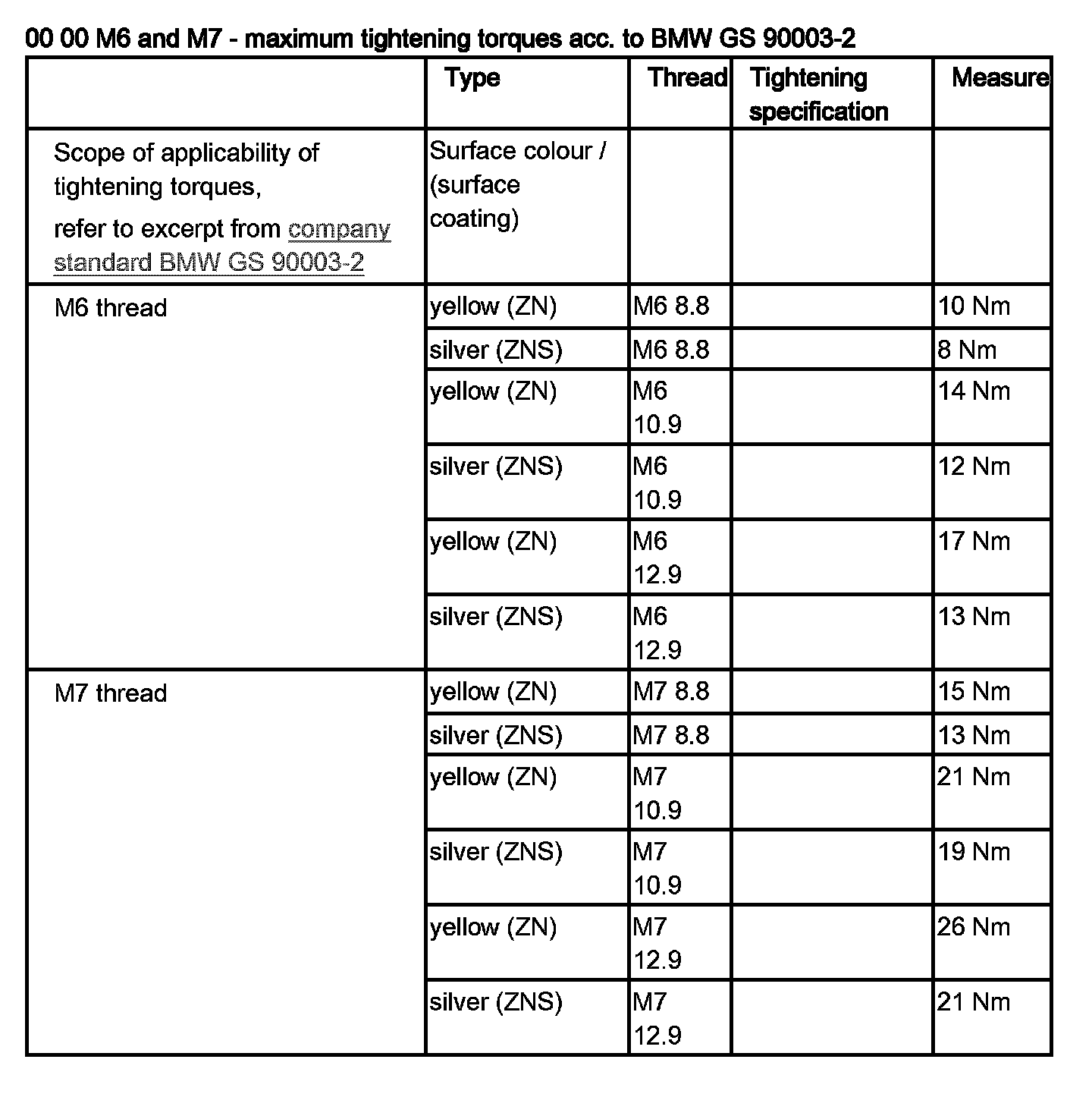 00 00 ... M6 and M7 - Maximum Tightening Torques Acc. to BMW GS 90003-2