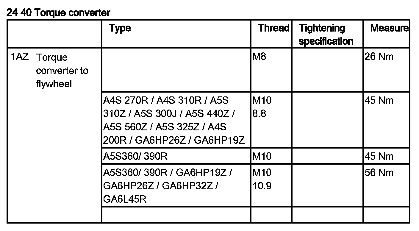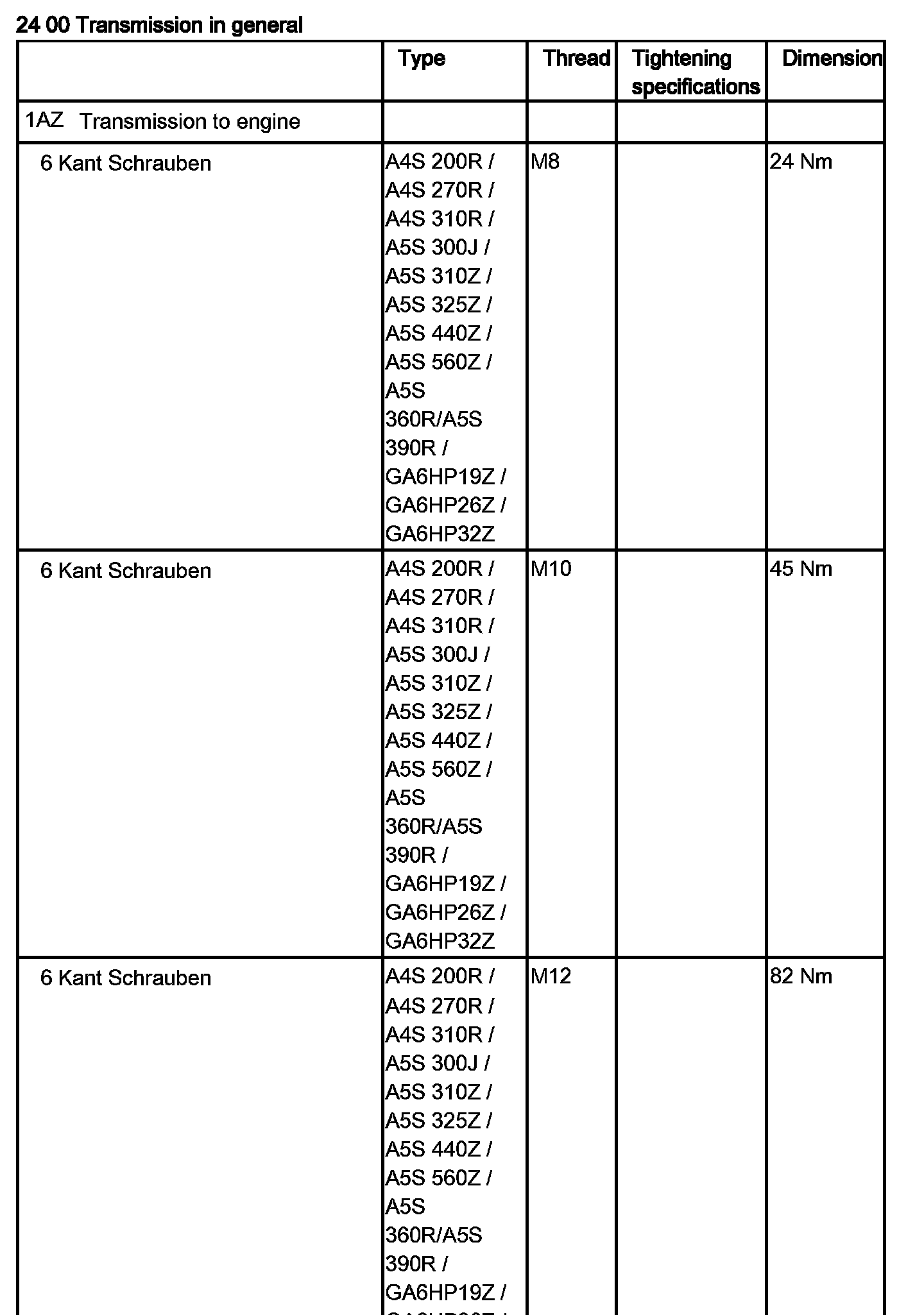 Tightening torque and angle of rotation, aluminium screws/bolts 24 00 2AZ (7,8,9,10,11).