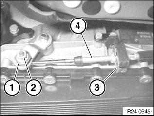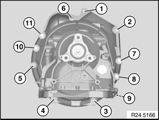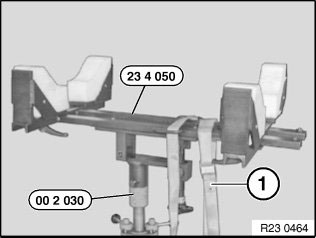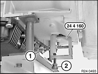 Insert special tool 24 4 160 into recess of transmission housing and clamp gently with screw (1).