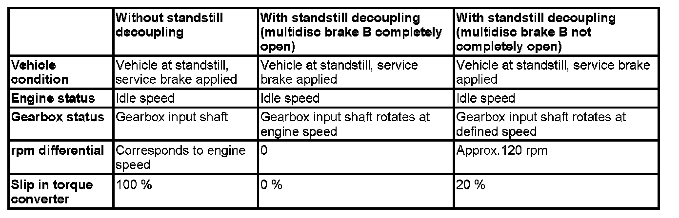 To enable driving off free of deceleration and load alteration, multidisc brake B is not completely opened. A slight slip of approximately 20 % remains so that some torque is transmitted to the torque converter. If multidisc brake B was completely open, no torque would need to be transmitted to the converter (except the inner friction in the gearbox). Jerking could result when driving off. The following example shows the difference in the gearbox between a vehicle with/without standstill decoupling. Values are approximate because inner friction was not taken into account.