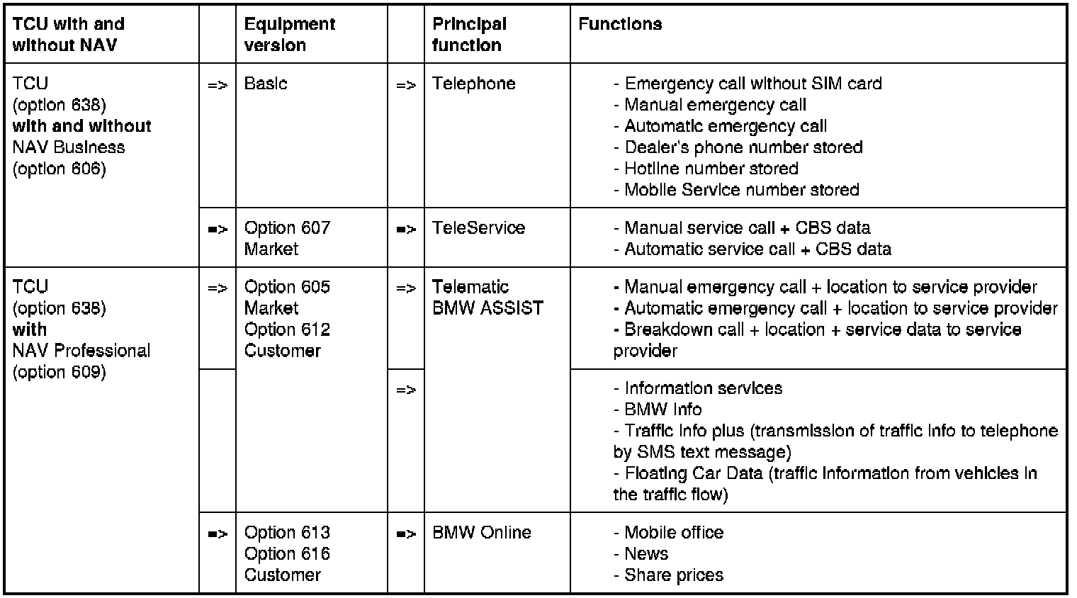 If option 605 "Basic fittings for telematics" is installed, the TCU will first try to establish a voice connection to the service provider. In addition, an SMS text message will be sent to the service provider giving the coordinates of the vehicle's location.