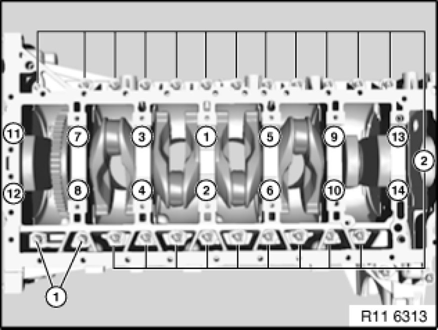 Drive in both nozzles (1) with special tool 11 9 360 11 9 360 Drift on left and right into crankcase.