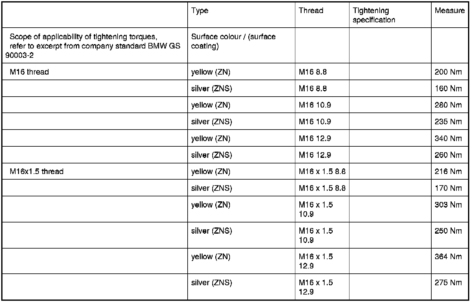 00 00 M16 and M16x1.5 - maximum tightening torques acc. to BMW GS 90003-2