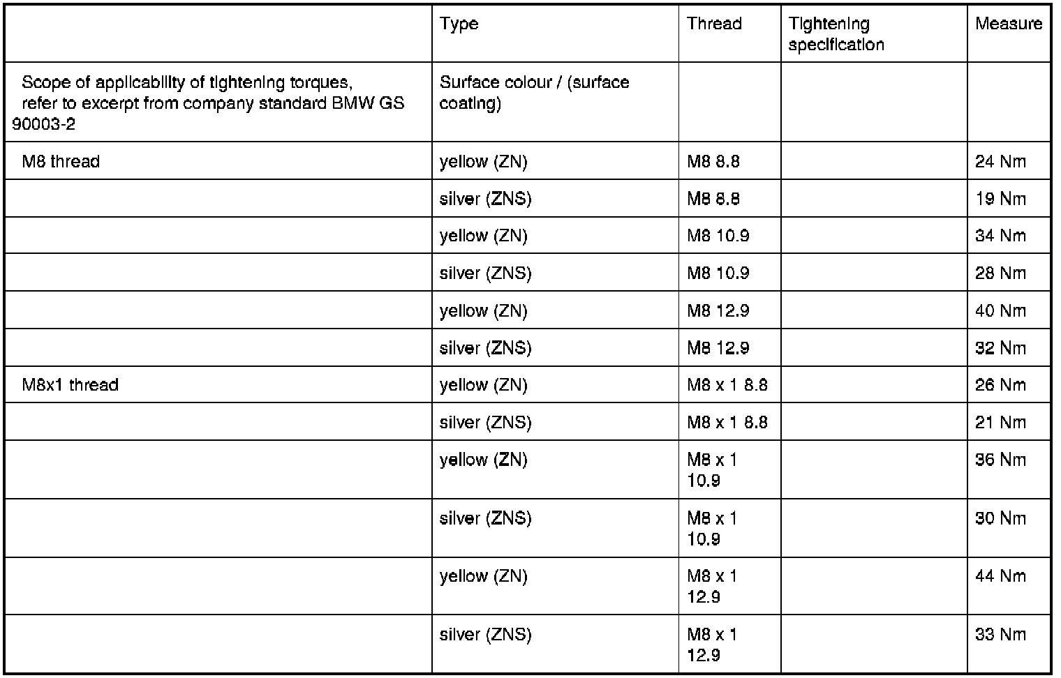M8 and M8 x 1 - Maximum Tightening Torques Acc. to BMW GS 90003-2