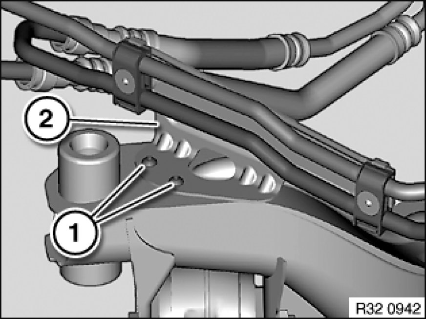 Remove bracket (2) for transmission oil cooler lines from front axle carrier.