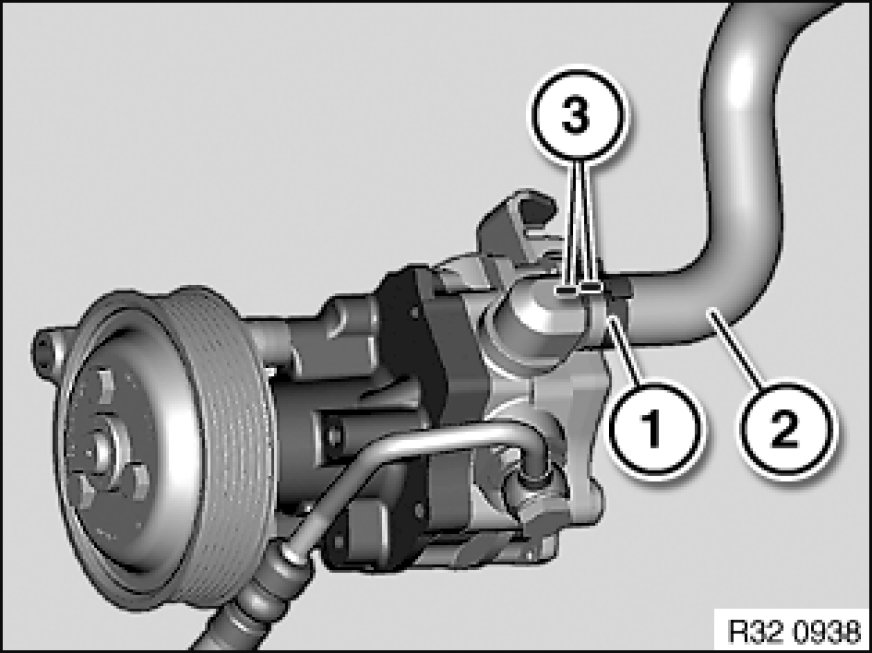 Detach suction line (2) from vane pump; if necessary, remove return line for power steering from front axle carrier.