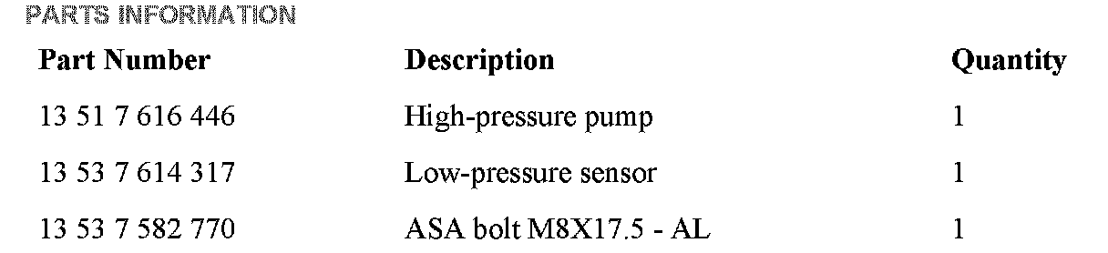 6. [NEW] Verify the DCSnet vehicle repair history. If the high-pressure pump was recently replaced with P/N 13 51 7 613 933, 13 51 7 594 943 or with its supersession P/N 13 51 7 616 170, no more action is required.