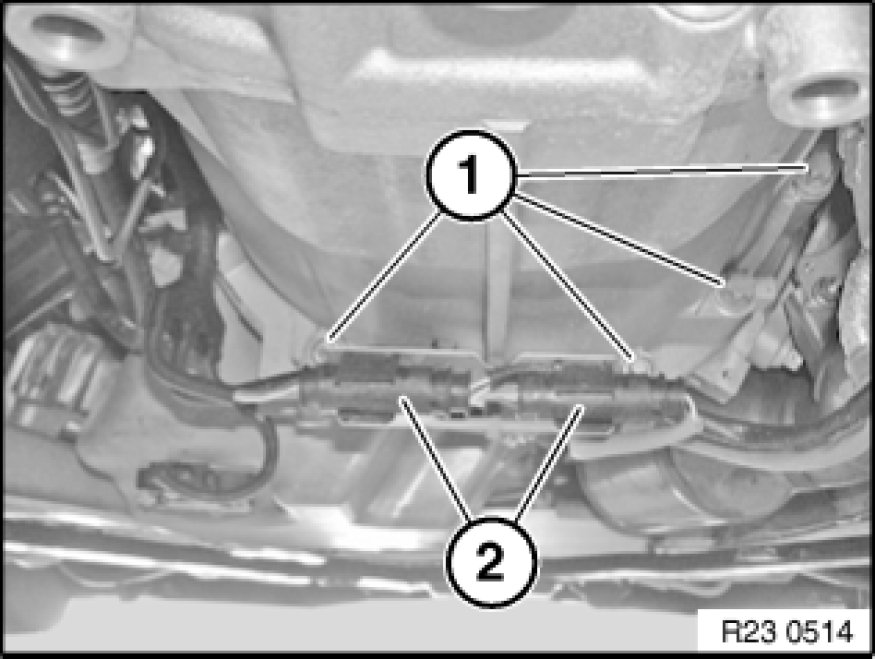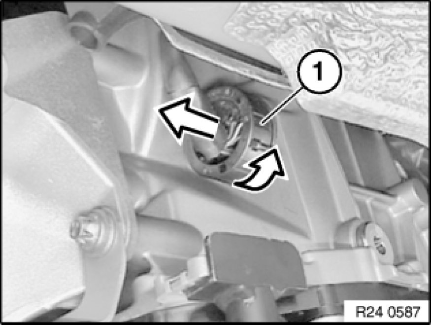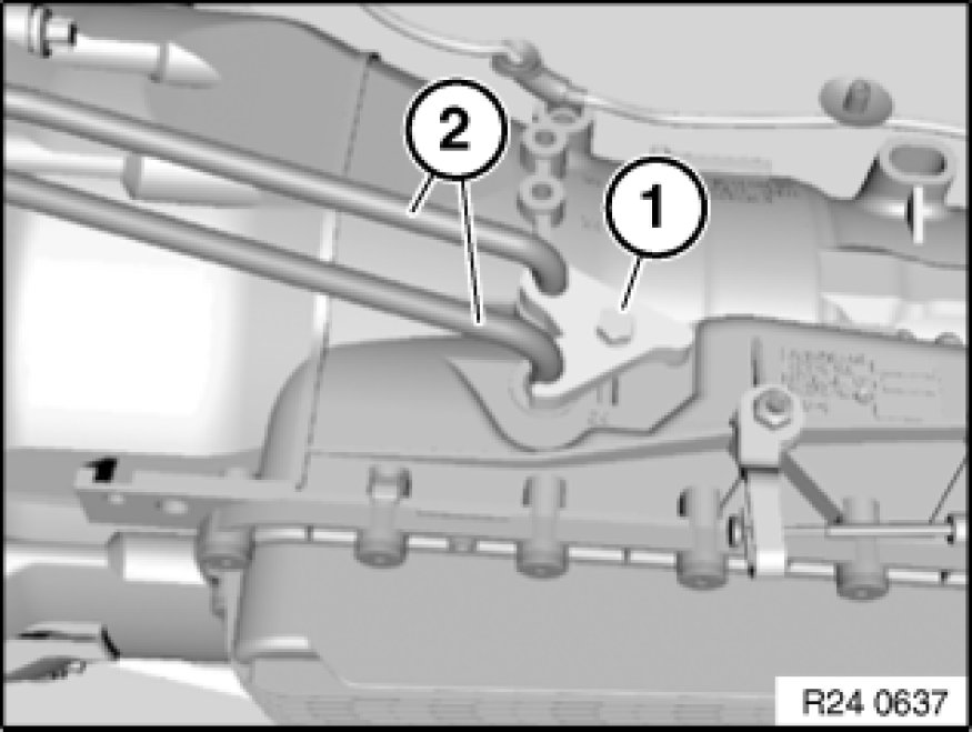 Insert special tool 24 4 160 24 4 160 Support Bracket into opening of transmission housing and clamp gently with screw (1).