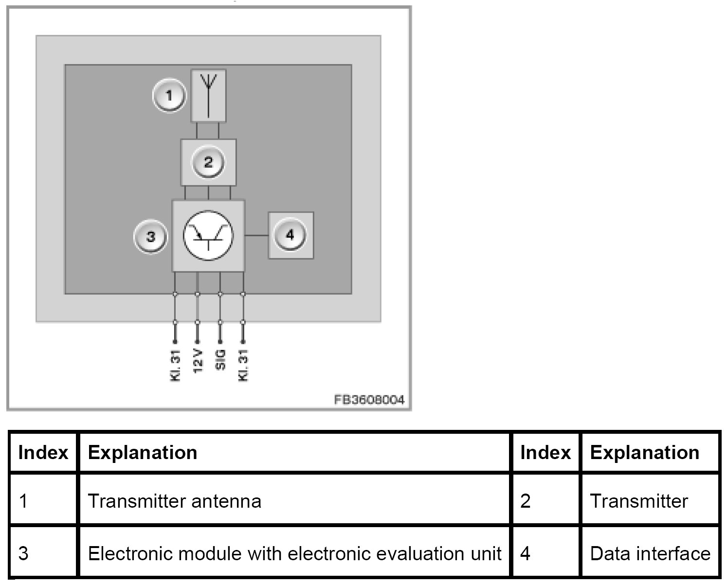 The tyre pressure monitor is a system for monitoring the tyre pressure while the vehicle is being driven. It is offered exclusively in the USA (legal requirement) and as an optional extra in Canada. At the request of the RDC control module (in cycles of 54 seconds), a message is queried via the RDC transmitters (125 kHz) by each wheel electronics system (mounted in the wheel drop centre). The message is then sent across a high-frequency transmission path (433 MHz) to the RDC antenna.