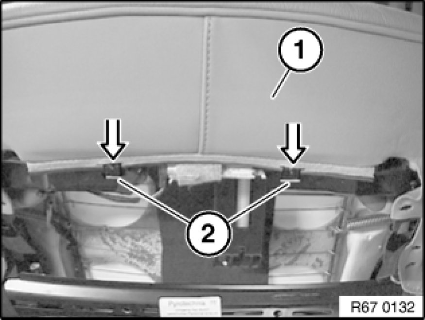 Pull backrest cover (1) in direction of arrow over metal lugs (2) and detach.