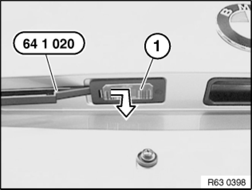Slide license plate light (1) in direction of arrow slightly and lever out with special tool 64 1 020 64 1 020 Release Hook.
