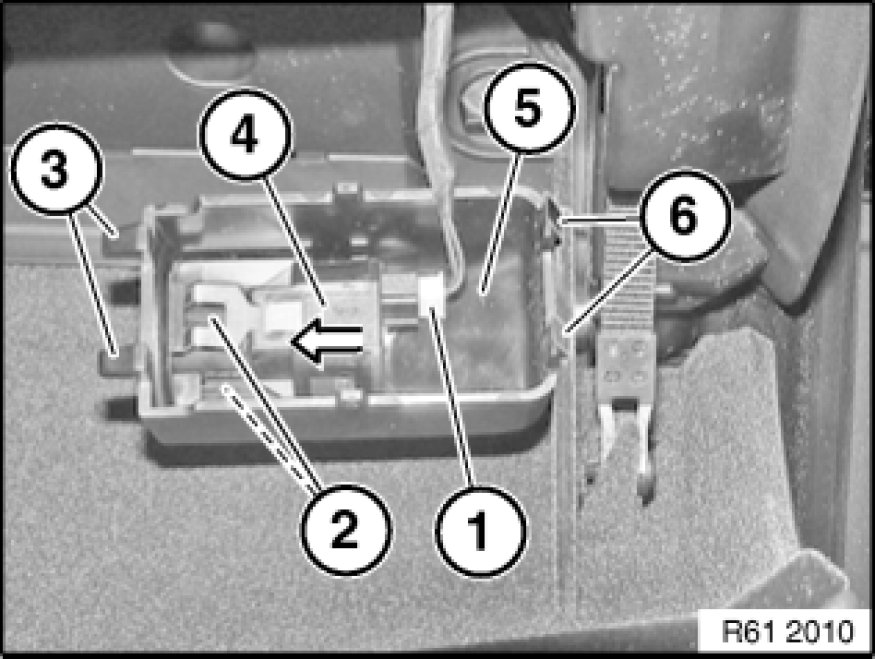 Feed switch receptacle for passenger airbag deactivation (1) in front area in direction of arrow out of glovebox housing (2).
