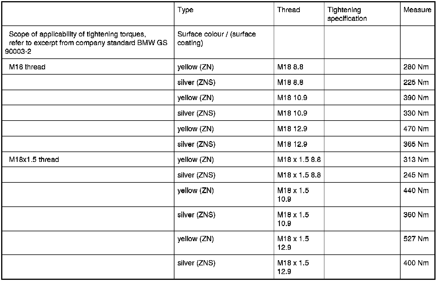 M18 and M18x1.5 - Maximum Tightening Torques Acc. to BMW GS 90003-2
