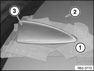 Mask roof (2) around empty housing for roof-mounted aerial (3) with yellow plastic adhesive tape (1). To do so, slide plastic adhesive tape under empty housing (3) slightly.