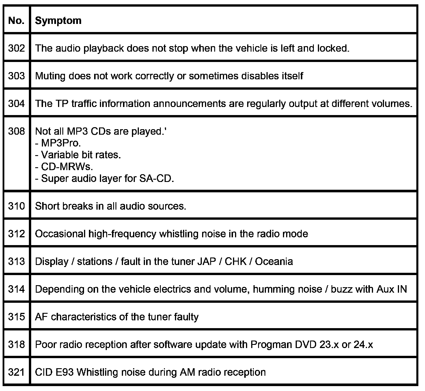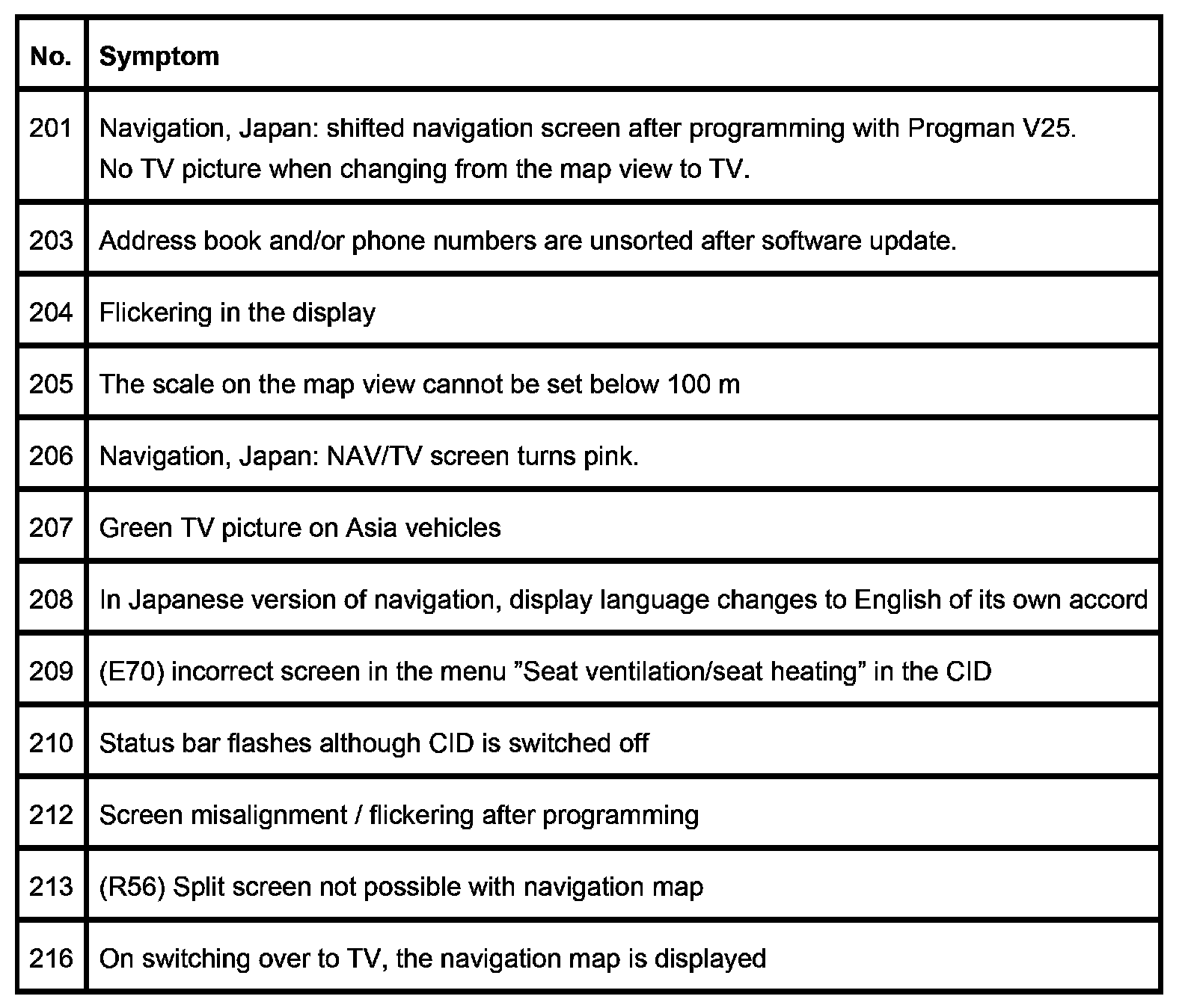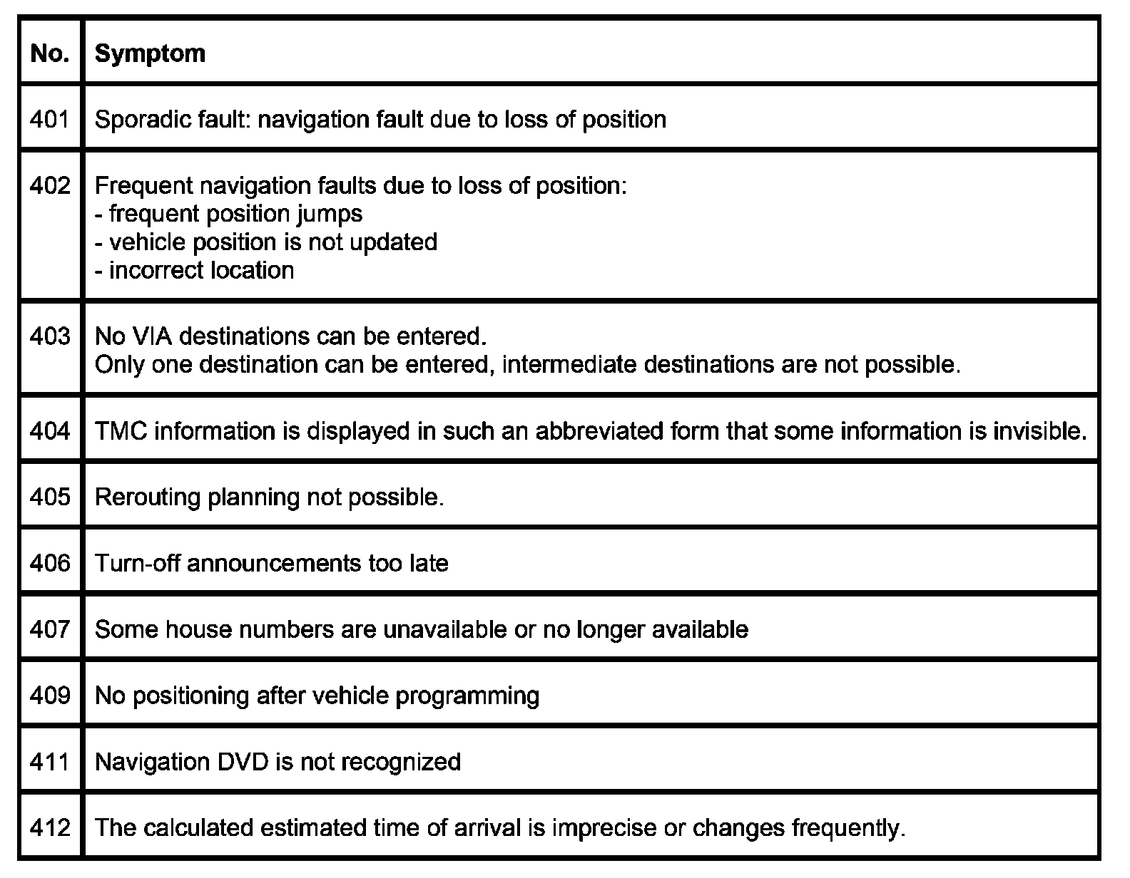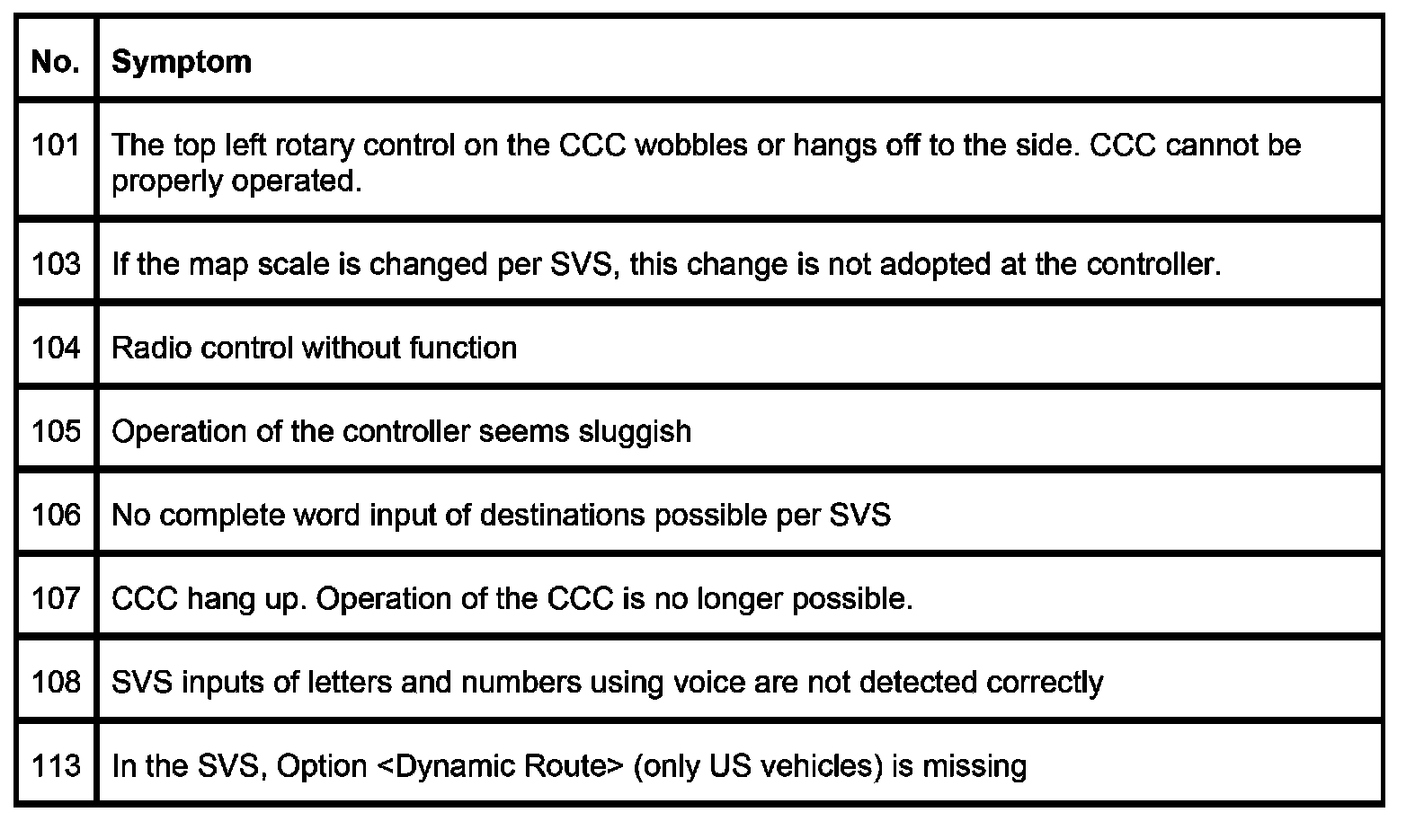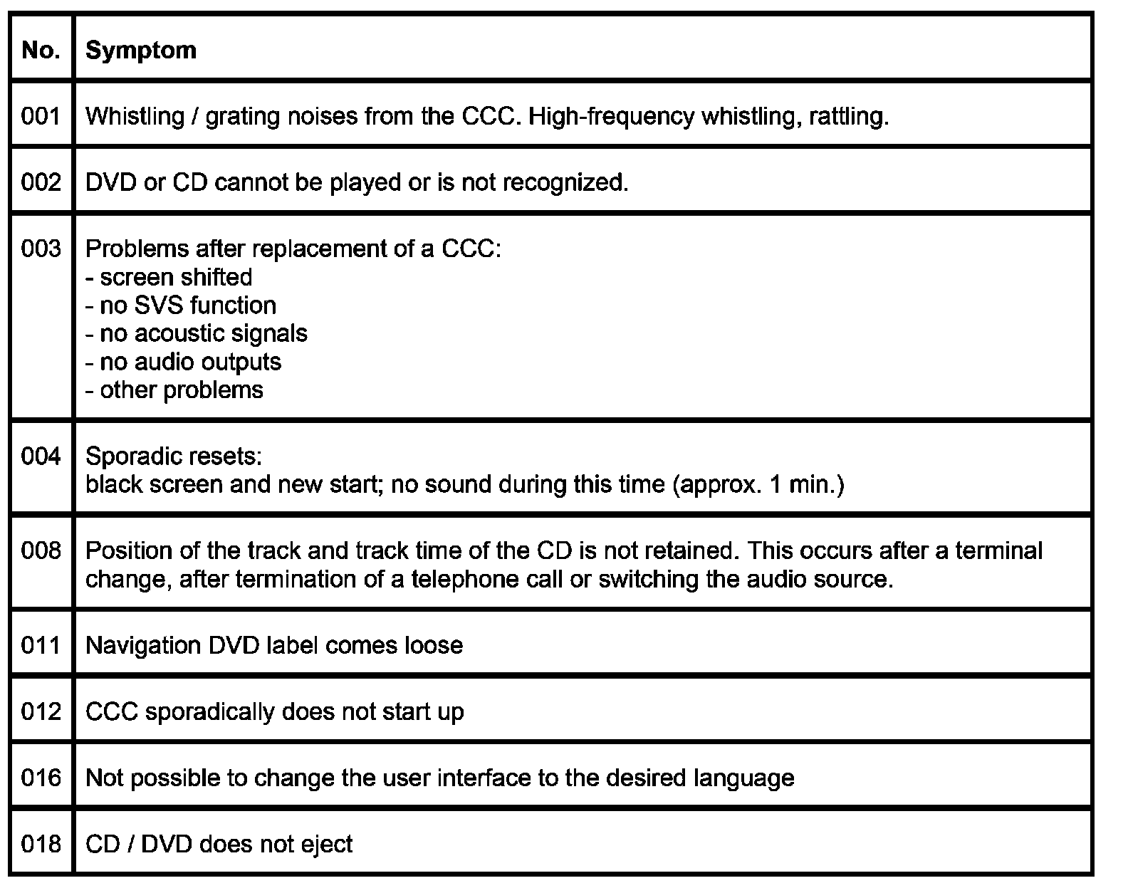 The navigation system Professional (CCC) is a complex control module with a large number of possible fault patterns. The following list shows known symptoms in the functional area CCC audio and navigation. Fault patterns from the functional areas of telephone and Telematic services as well as integrated climate control are not covered in this test module.
