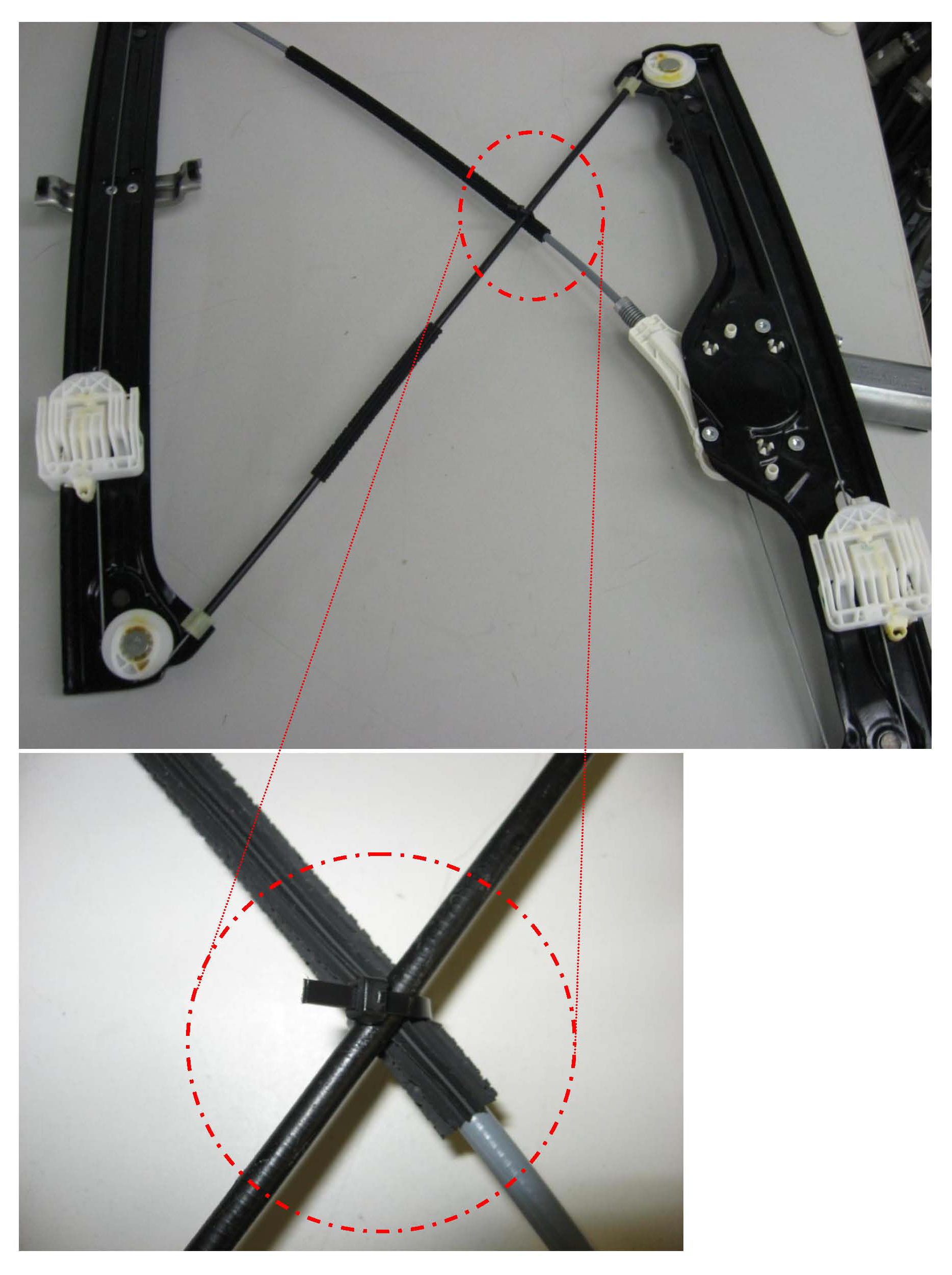 This cable crossing is behind the inner door structure, but it can be accessed without removing the window regulator or any other components.