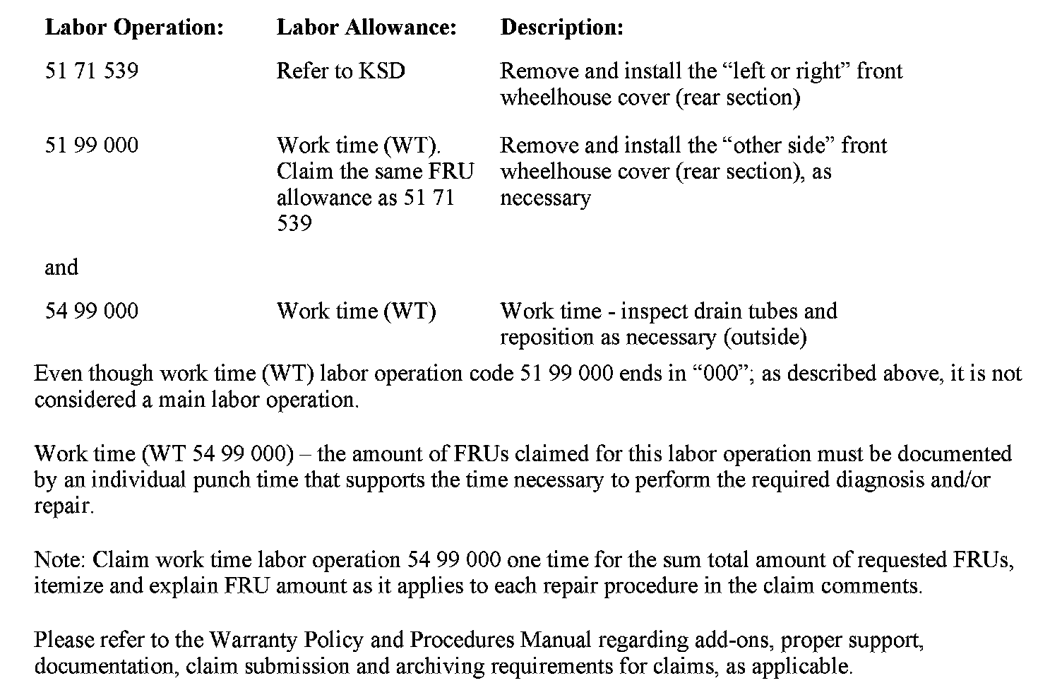 a. Remove the fender liner on the side[s] that is kinked per Repair Instruction RA 51 71 038, in order to inspect the end of the drain tube, to ensure that the spout is still facing downward.