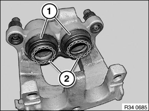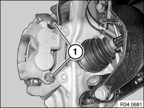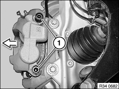 Unscrew guide bolts (1). Withdraw brake calliper backwards.