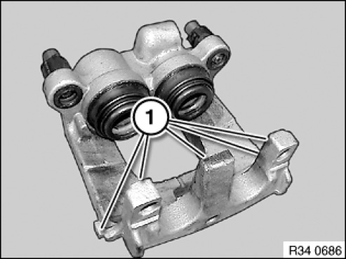 So as not to damage the surface coating, if possible do not mechanically clean pad guides (1). Instead, clean with brake cleaner and apply a thin coating of brake pad paste.